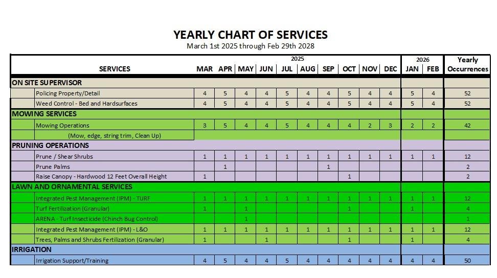 A pesticide program will be provided as needed to suppress infestations of weeds and insects on all turf areas, plant material, and landscape beds where and when applicable.